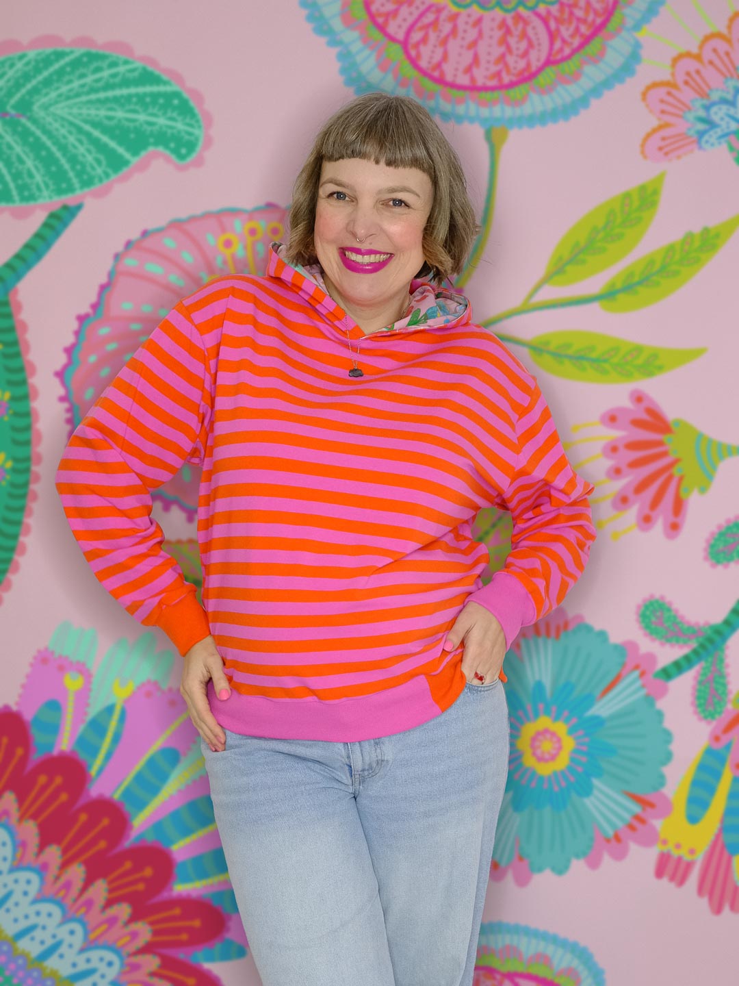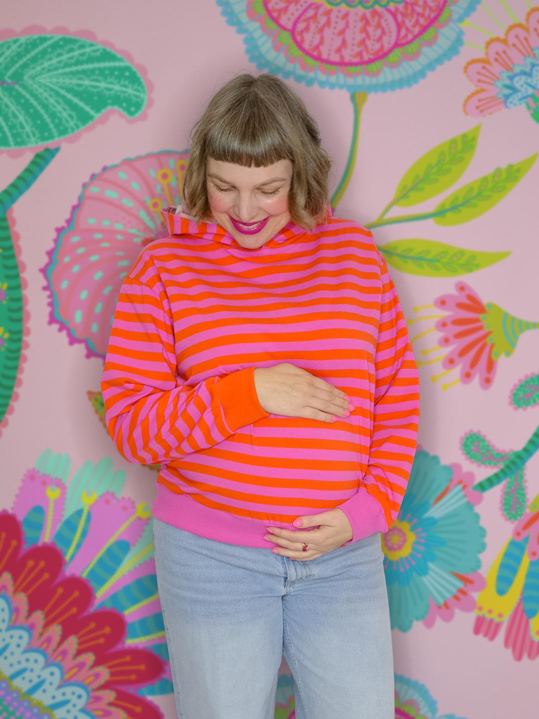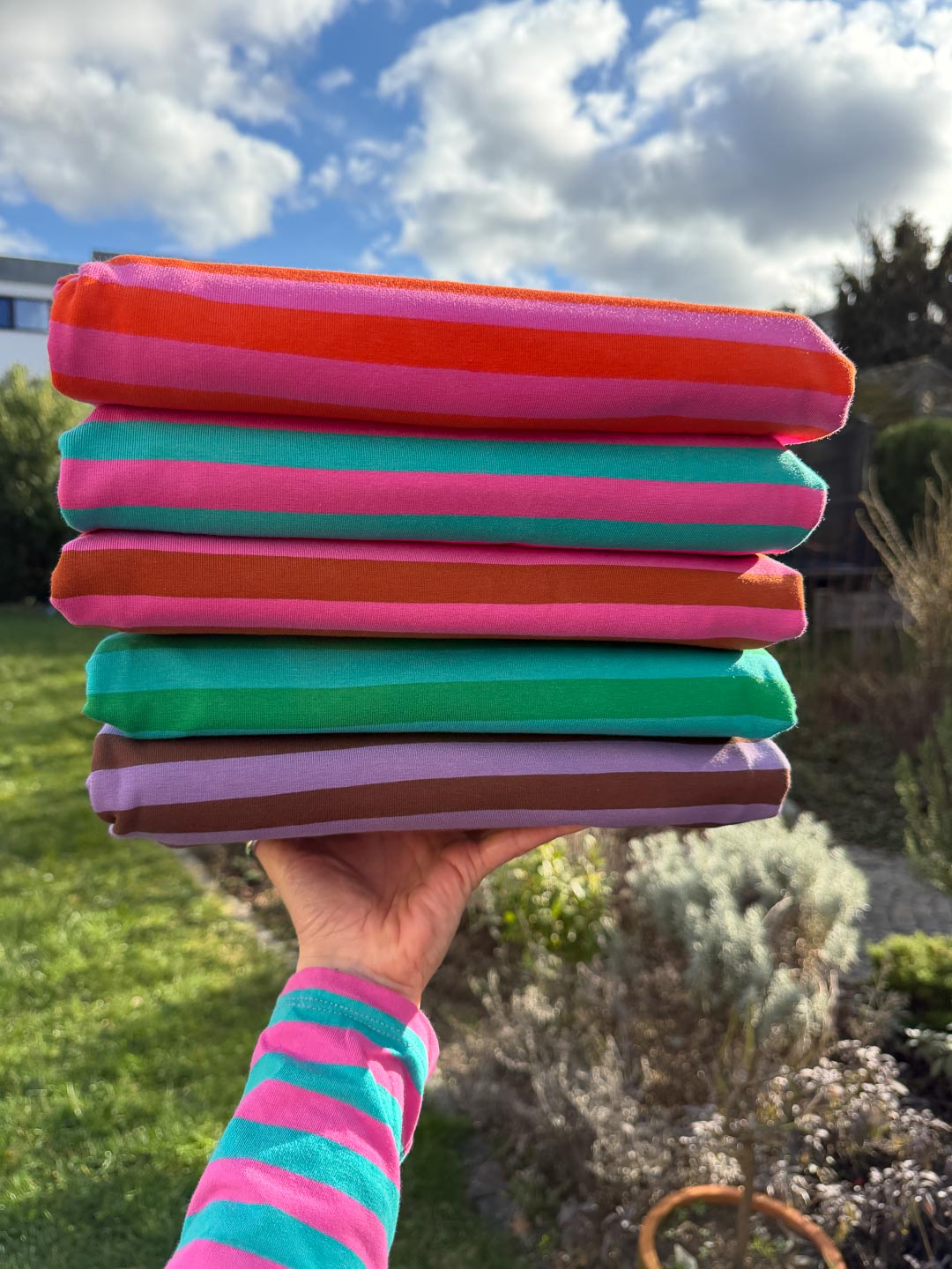 Hochwertiger Bio Jersey, gefertigt aus 95% Bio-Baumwolle und 5% Elastan. Unsere Ringel sind garngefärbt, die Streifen sind also gestrickt, nicht gedruckt und somit besonders hochwertig. Die einzelnen Ringel auf dem Butterweichen Bio-Jersey haben eine Höhe von 1,4cm. – Design by Jinny & Joe.