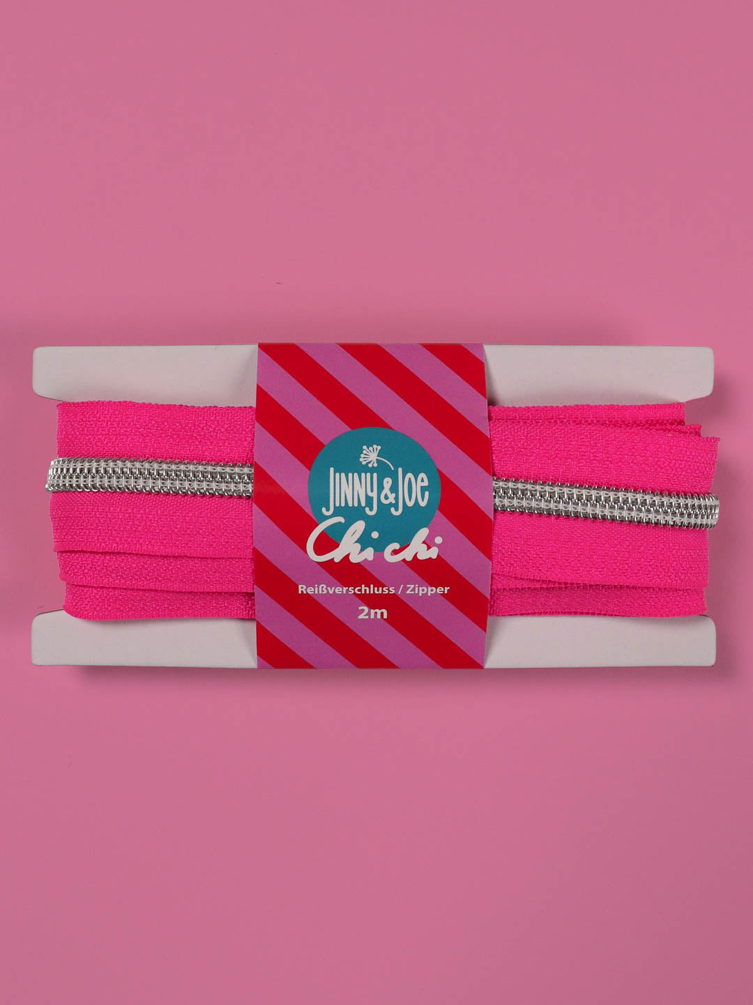 Knallige Farbe trifft auf metallischen Look: Der J&J Reißverschluss in Silber-Neonpink bringt Schwung in dein DIY-Projekt. Die 2 Meter lange, ca. 33 mm breite Reißverschlussbahn (#5) eignet sich super für Taschen oder andere kreative Ideen. Passende Zipper? Haben wir natürlich auch.