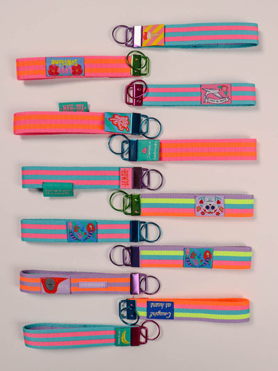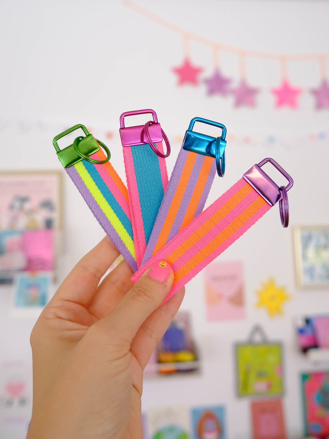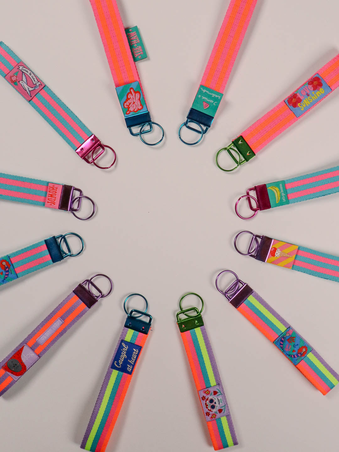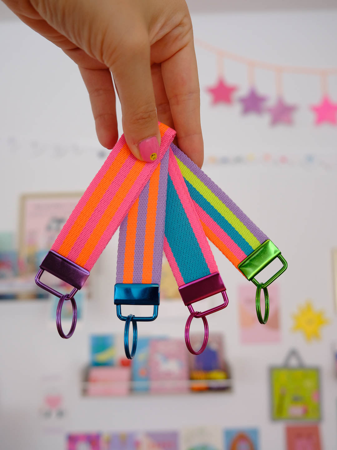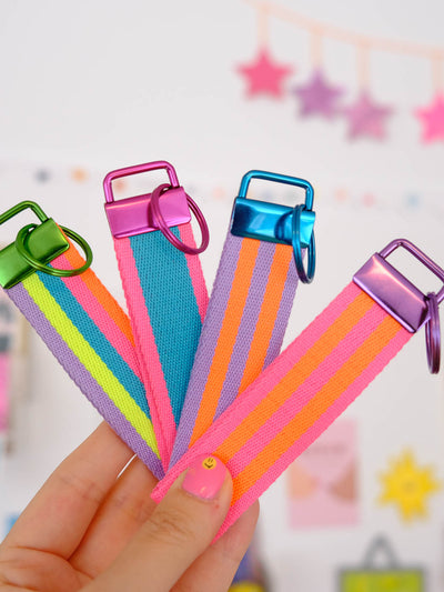 Eine Einheit besteht aus 4 Stück Schlüsselbandrohling inkl. Schlüsselring in grün, pink, lila und blau.