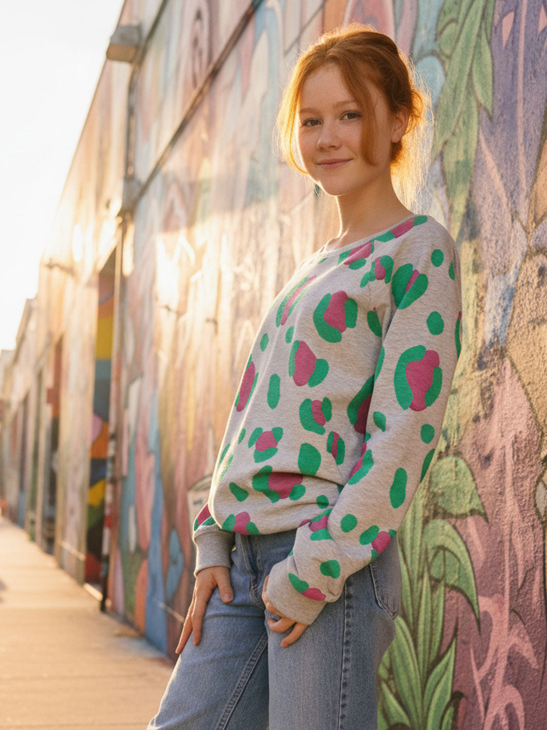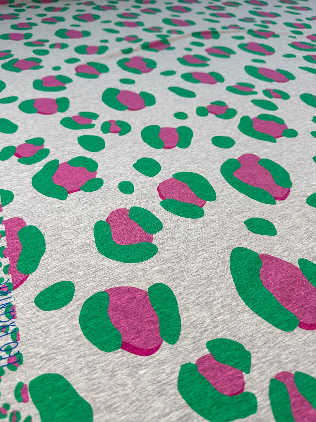 French Terry "Leo Excentric" in Melange bringt Farbe ins Grau! Der Stoff fällt schön und trägt sich angenehm. Durch die Mischung von hellem und dunklem Garn hat das Grundmaterial einen tollen Melange-Effekt. Die Melange Oberfläche des Materials scheint durch den bunten Leodruck durch.