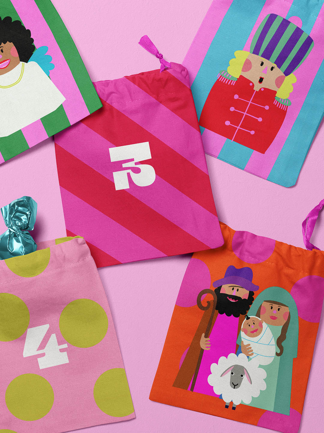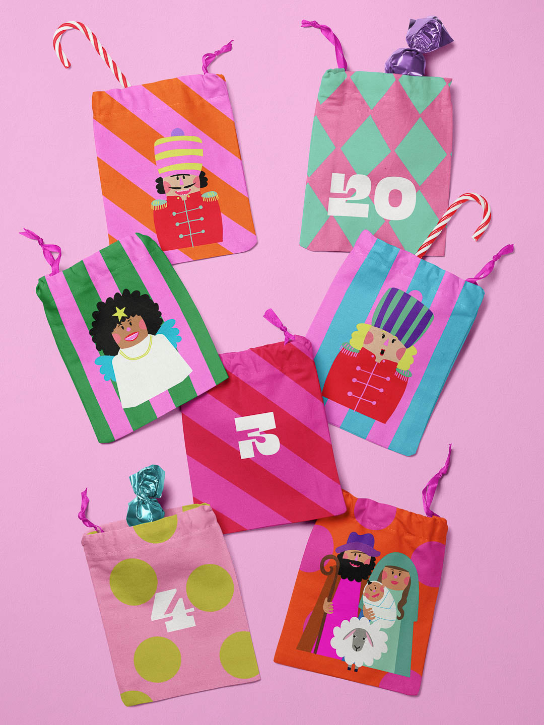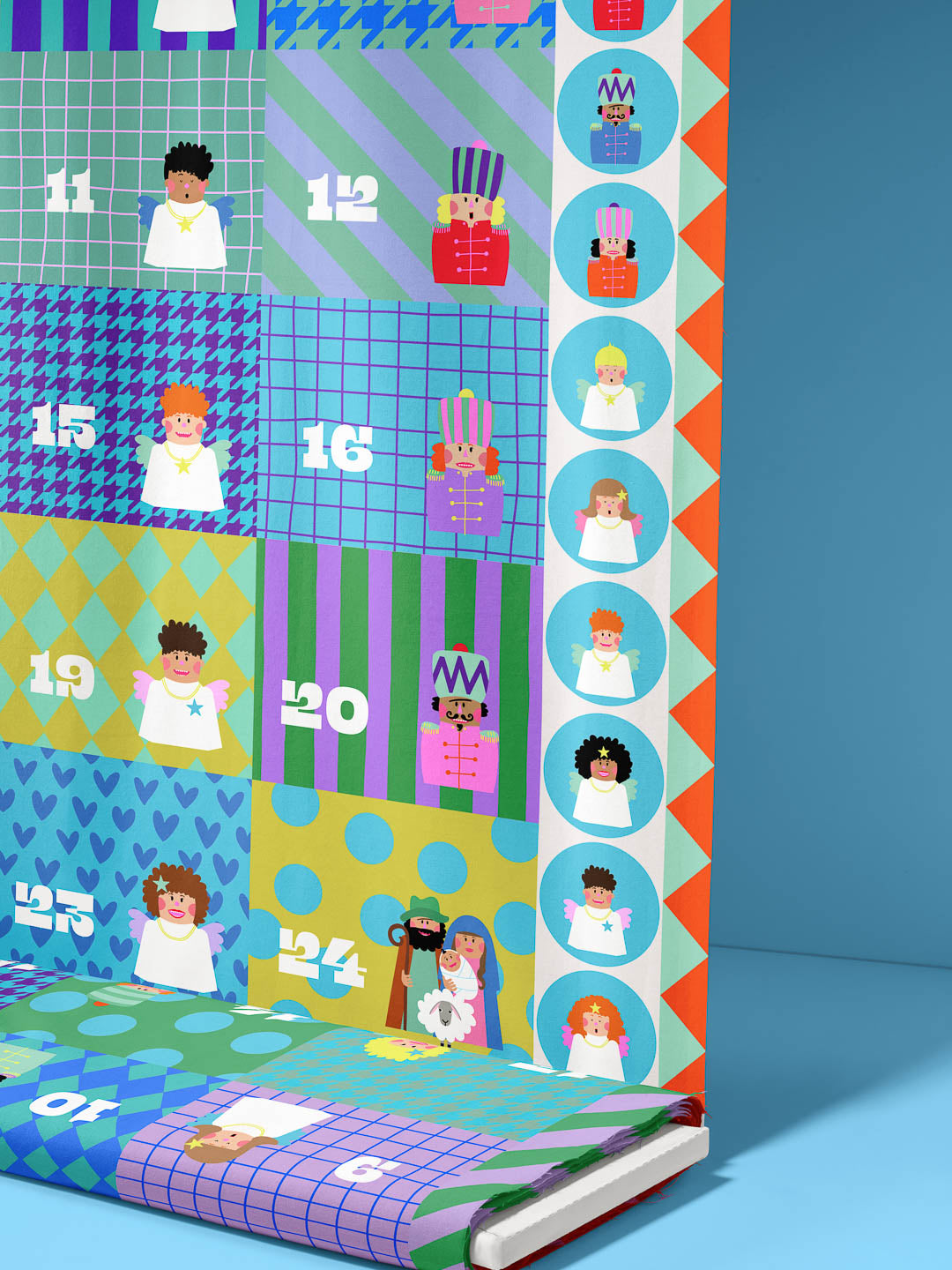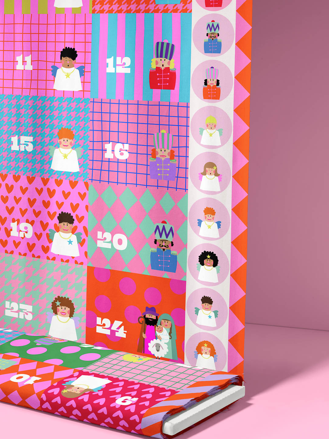 Gut, dass wir ein passendes Panel dafür haben! 24 unterschiedliche, durchnummerierte Rechtecke, aus dem du 24 Beutelchen für einen Adventskalender nähen kannst. Alles auf einem Stück Stoff! Witzige Nussknacker, Engelchen und Maria und Josef mit Jesuskind auf dem letzten Beutelchen, dürfen natürlich auch nicht fehlen. Alles in tollen leuchtenden Farben und mit einer Prise Witz für eine Holly Jolly Weihnachtszeit!